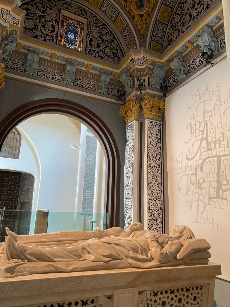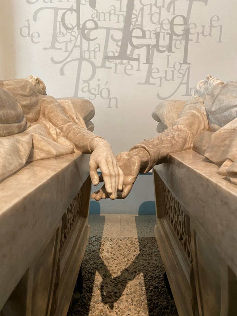 - Lo primero que se ve es un vídeo y luego el mausoleo de los amantes de Teruel. En él se pueden ver perfectamente los restos óseos por unos agujeritos. Es curioso ver que las manos no se juntan por no haberse formalizado ese amor. Las tumbas estuvieron en diferentes sitios hasta que se creó este mausoleo.
