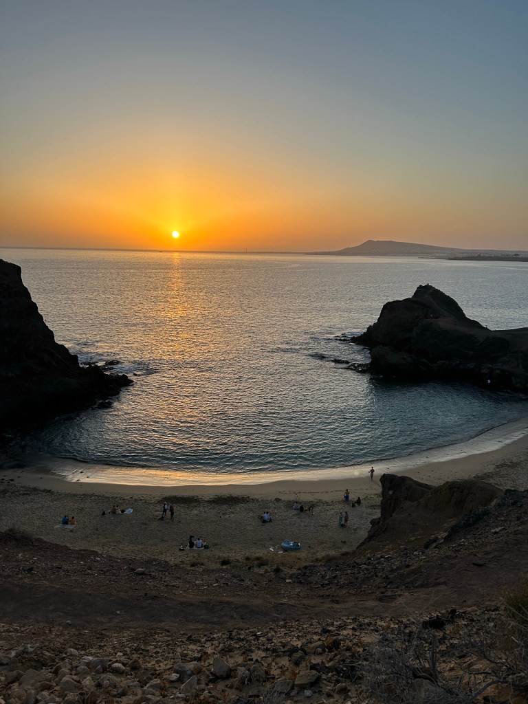 PLAYA DE PAPAGAYO. Es una reserva natural. Hay que pagar por entrar, pero como leí en un blog, a partir de las 16:30 (hora que llegamos nosotros) o igual algo antes, ya no hay nadie y se puede acceder de forma gratuita. La carretera para llegar allí es de cabras y tiene bastantes baches. El atardecer desde aquí es precioso.