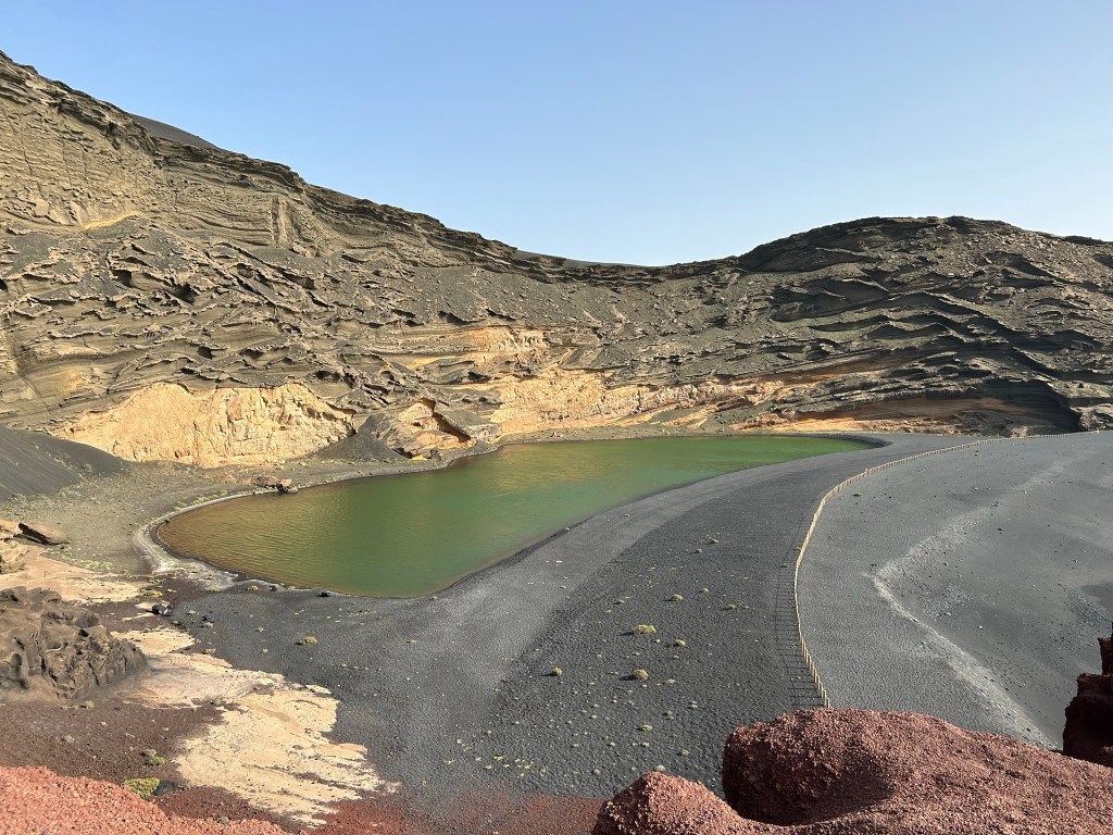 CHARCO DE LOS CLICOS. Actualmente no se puede andar al lado del Charco Verde, solo se puede ver desde el Mirador de los Clicos. Para llegar aquí es mejor poner en GoogleMaps El Golfo y desde allí sale el camino para subir al mirador.