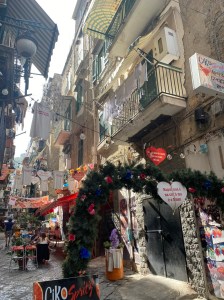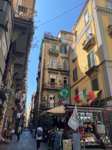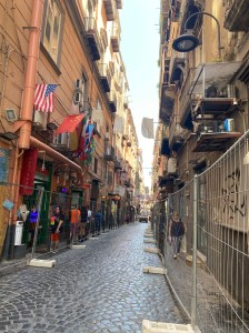 Via Tribunali. Esta calle está en el centro de Nápoles, la recorrimos varias veces. Destacan sus tiendecitas y su veintena de iglesias. En esta calle se encuentra un grafiti de Banksy llamado “Virgen de la Pistola” ubicado en la plaza Gerolomini.
