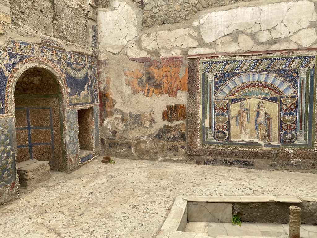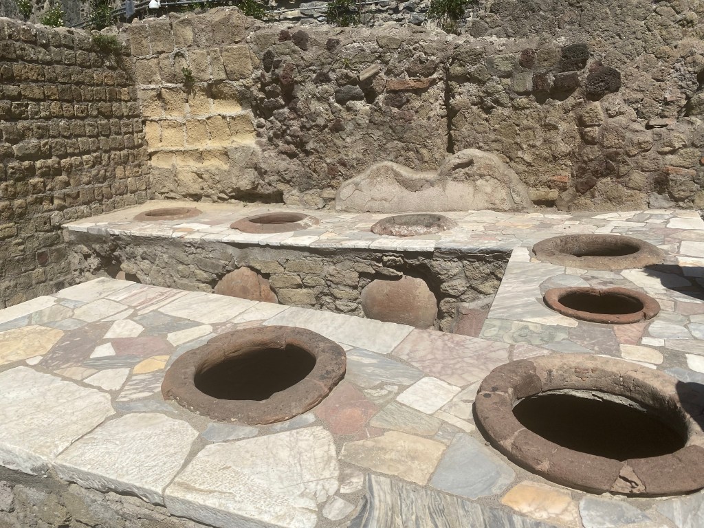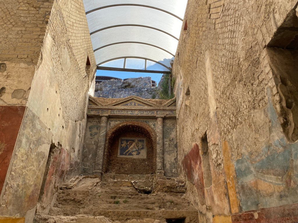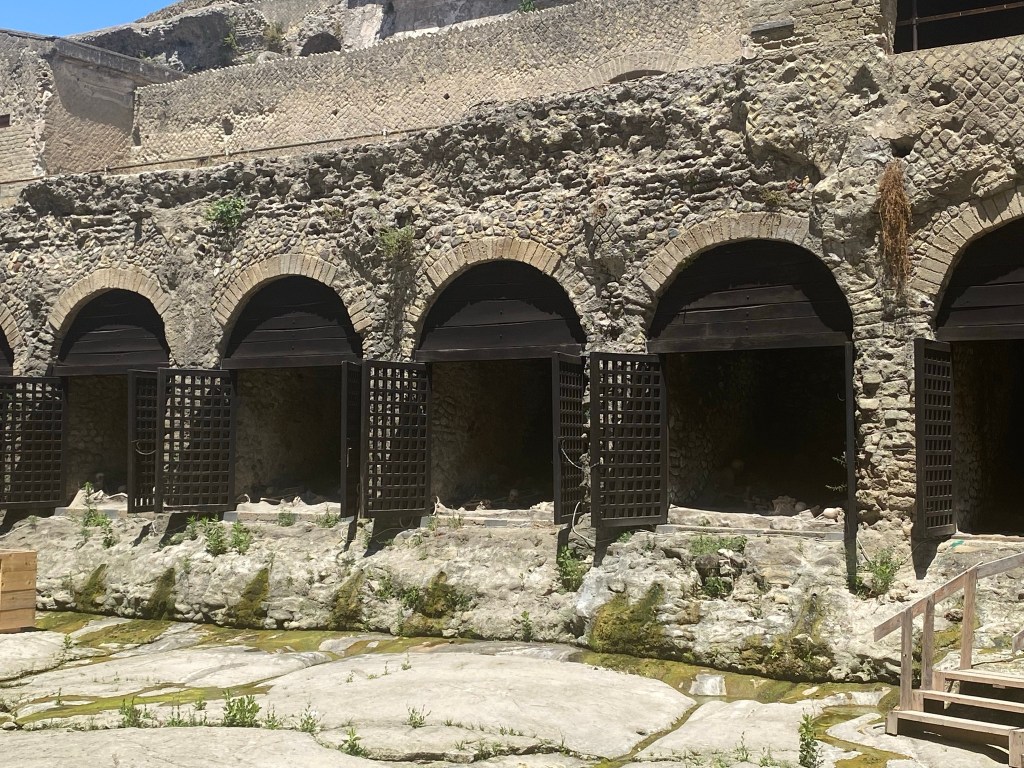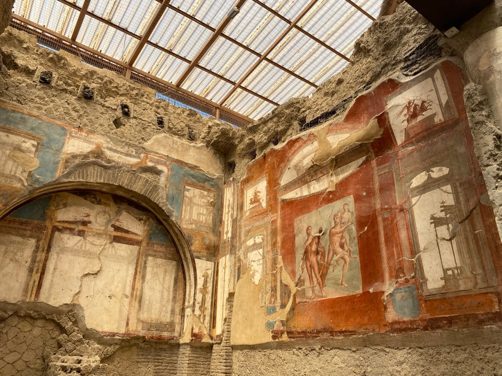 Nosotros hasta que no fuimos allí, no supimos de su existencia. Mucho menos conocida que Pompeya pero mejor conservada. Hay gente que combina la visita de Pompeya con Herculano, para mi es demasiado, pero os dejo enlace por si queréis contratar excursión a los dos sitios. Nosotros lo visitamos el día que nos íbamos a la Costa Amalfitana. Aparcamos en el parking que hay en el propio lugar por 13 € el día entero. Se puede ir en tren o en autobús también y se tarda unos veinte minutos. Impresiona ver Herculano desde arriba y pegado al recinto las casas de la gente. Aunque había muchos menos visitantes, os recomiendo empezar a visitarla al revés, para ir a contracorriente del resto.