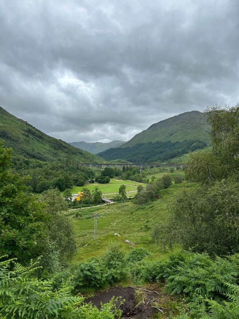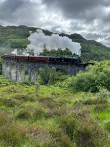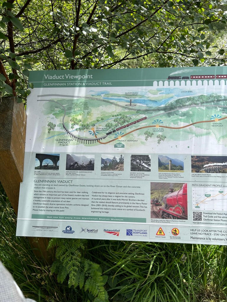 Y llegó el momento más esperado por los fans de Harry Potter: ver en acción el famoso tren de vapor de la película. Incluso si no eres fan de la saga, vale totalmente la pena: el sonido del tren, el paisaje y el ambiente hacen que la experiencia sea realmente especial. Eso sí, no esperes tener el lugar para ti solo. Es un punto muy popular, así que recomiendo mirar bien los horarios y llegar con bastante antelación (mínimo media hora y yo recomendaría antes, porque justo media hora antes el parking empieza a llenarse) para encontrar un buen sitio. En nuestro caso, el tren de la mañana salía de Fort William a las 10:15, así que por el viaducto pasaría entre las 10:45 y las 11:00 (finalmente lo empezamos a ver a las 10:49). Empezamos a andar a las 10:10, y os puedo asegurar que ya estaba la montaña bien llena. Por la tarde, pasa entre las 15:00 y las 15:15, pero os aconsejo mirarlo en la web por si hay algún cambio. En el cartel que había allí venían otros trenes más: a la 13:20 y las 18:05, pero al menos el de la 13:20 no fue tan impresionante como el de las 10:45.