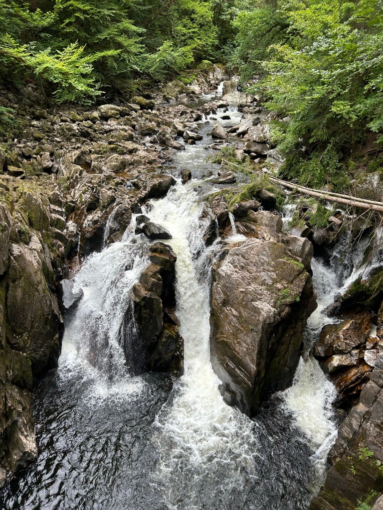 DUNKELD. Hicimos una ruta por Hermitage Dunkeld. Hay varias rutas, de diferentes dificultades y tiempos. Nosotros hicimos la básica que es circular y bastante asequible, tanto que incluso vimos a una familia con carrito de bebé. La ruta va dentro de un bosque de abetos de Douglas gigantes. La mayoría del tiempo se va en paralelo al río, se ven varias cascadas, pero la más grande es la Black Linn, que se observa desde el mirador que hay en un pabellón. Nosotros tardamos una hora y media, caminando tranquilos, parando en todos los puntos de interés y adaptando el ritmo a nuestra hija de año y medio. Hay que pagar un parking de 4 libras por día.