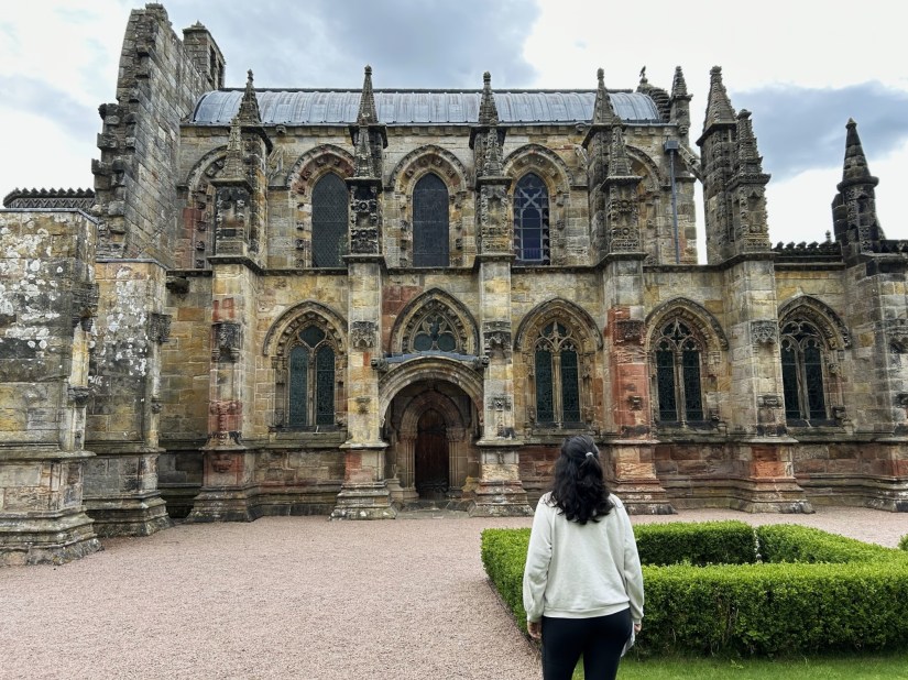 CAPILLA ROSSLYN. Construida en 1446 por el clan St Clair, está rodeada de leyendas e historias misteriosas, desde templarios hasta fantasmas y secretos ocultos. Su decoración detallada incluye símbolos bíblicos y paganos, con el famoso Green Man, un extraño rostro rodeado de vegetación que simboliza el ciclo de la vida; y el Pilar del aprendiz, protagonista de una trágica leyenda. Durante siglos cayó en el olvido, pero fue restaurada en el siglo XIX y hoy es un icono turístico, fue uno de los sitios con más turistas que vimos. Su fama creció aún más con El Código Da Vinci, que la convirtió en parada imprescindible. Primero hay un centro de información donde hay varias exposiciones para explicar la historia del lugar y una zona para los más peques. Y cuando se sale, se ve la capilla. Dentro no se puede hacer fotos, y cada cierto tiempo hay un guía en inglés explicando lo más importante de la capilla. También hay unas cartulinas donde te animan a buscar escenas y te explican su proveniencia. La capilla me la esperaba más grande, pero eso sí no podrás parar de observar cada detalle de su interior y su exterior. Hay que reservar con tiempo el día y la hora de forma online. Cuando llegamos allí estaba completo y no se podía comprar la entrada en taquilla. El precio es de 11,50 libras por adulto, menores de 17 años la entrada es gratuita. NO incluida en la tarjeta Explorer Pass. Estuvimos alrededor de una hora.