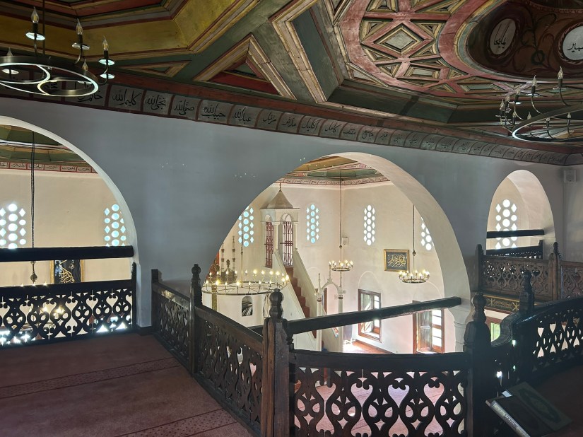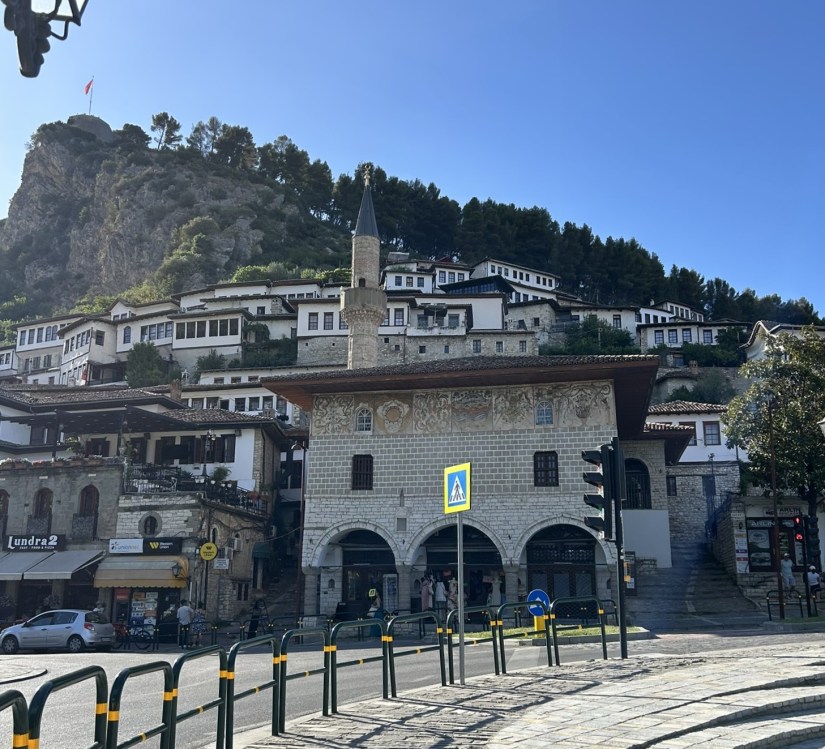 Pasear sin rumbo por esas calles empedradas y con escaleras (no apto para ir con el carrito). Destacaría la Mezquita de los solteros (Bachelors’ Mosque), es un pequeño templo otomano del siglo XIX situado en el centro histórico de Berat, conocido por sus elegantes frescos exteriores y su esbelto minarete.