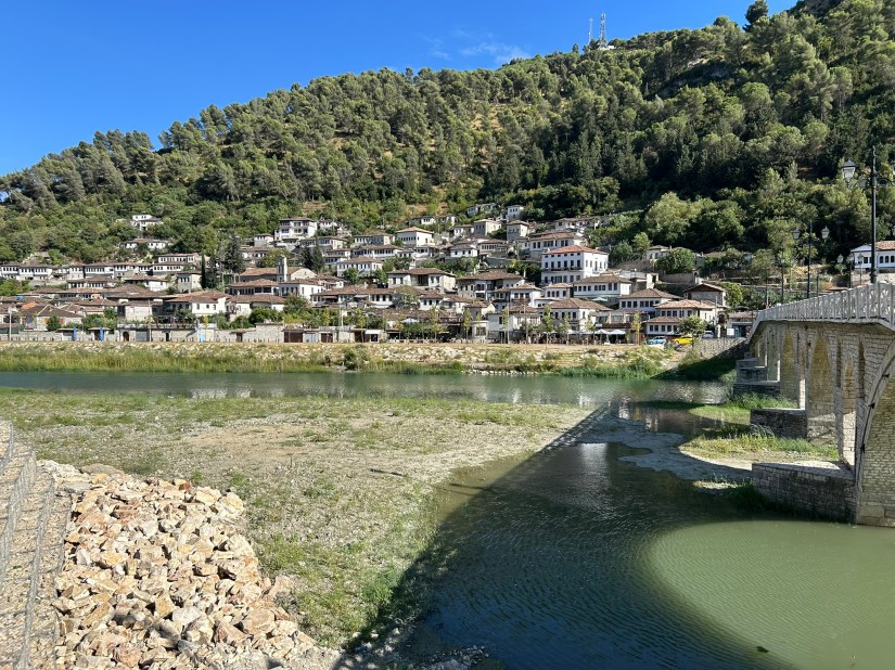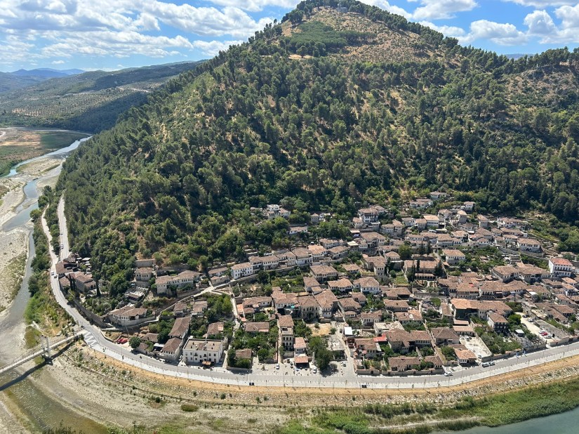 La ciudad de Berat, conocida como “la ciudad de las mil ventanas” por sus casas otomanas. Se sitúa en el centro de Albania y le atraviesa el río Osum. Es uno de los destinos más emblemáticos del país gracias a su extraordinario patrimonio histórico y arquitectónico, motivo por el cual su casco antiguo fue declarado Patrimonio de la Humanidad por la UNESCO en 2008. Berat destaca por sus barrios históricos de Mangalem (con sus casas blancas de estilo otomano que se escalonan en la ladera), Gorica (al otro lado del río) y Kala (antigua fortaleza aún habitada).