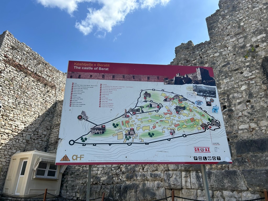Pasear por el castillo es gratuito. Hay zonas donde se puede pasear por encima de la muralla, y varios carteles (y flechas para seguir un recorrido) indicando lo que se ve. Se puede acceder a varias iglesias (su población era mayoritariamente cristiana) con unas pinturas bastante antiguas, ver varias ruinas, sobre todo de la mezquita blanca y roja. No me obsesionaría con ver todo, si se siguen los carteles no tiene pérdida. Le dedicamos unas dos horas y media a ver toda la zona del castillo. Siempre se puede coger un Free tour por el castillo de Berat.