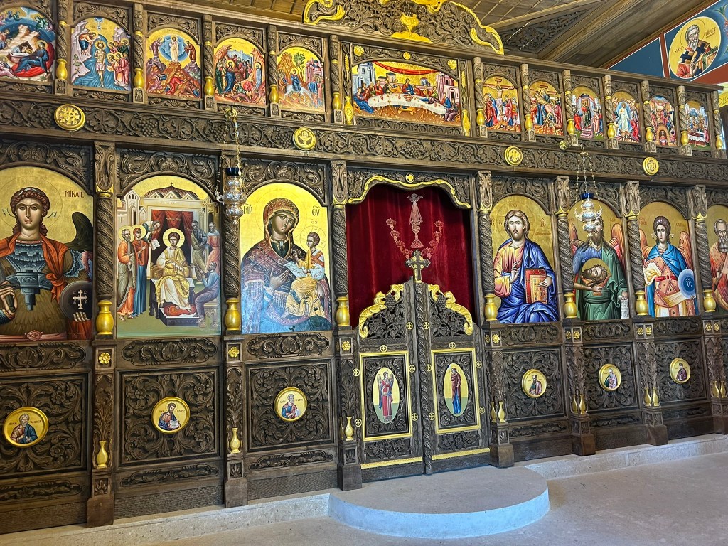 En su interior destacan el suelo de losas de piedra, un iconostasio de madera tallada y recubierta de pan de oro, y una colección de 173 piezas procedentes de iglesias y monasterios de Albania. Actualmente es un museo (Museo de Onufri) de pago, nosotros solo la vimos por fuera.