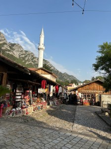 Es un bazar antiguo de arquitectura medieval otomana con su suelo empedrado y donde se puede comprar todo tipo de souvenirs de Albania. No es muy grande pero nos encantó y no había casi gente. Nosotros a la vuelta lo vimos iluminado y aunque la mayoría de tiendas estaban cerradas tiene un encanto especial. El horario de las tiendas varía dependiendo de la caseta. Como se puede ver en la foto, no es muy agradable ir con carrito de bebé.