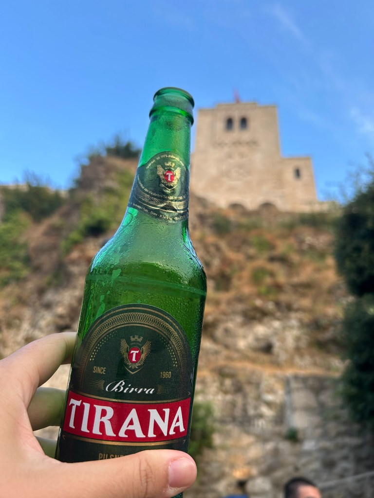 Krüje o Kruja fue la antigua capital y donde nació el famoso Skanderberg que lo veréis por toda Albania. Se ubica en lo alto de una colina, a unos 600 metros de altura. Krujë es de esos sitios que se sienten nada más llegar. Entre su castillo con vistas y su bazar lleno de historia, es el lugar perfecto para pasear sin prisa y empaparse de la esencia albanesa. Se ve rápido, sí, pero quedarse al anochecer tiene algo especial: el bazar iluminado cambia por completo el ambiente y lo vimos prácticamente solos.